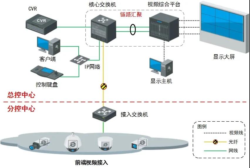 分控中心:負(fù)責(zé)對(duì)前端分散區(qū)域高清監(jiān)控點(diǎn)的接入、存儲(chǔ)、瀏覽、設(shè)置等功能;主要部署接入交換機(jī)、客戶端等。